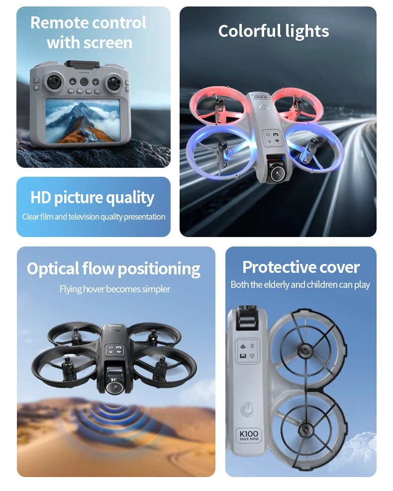 Mini drone 2025 équipé de deux caméras pour des prises de vue aériennes en 6K HD. Convient aux débutants et aux pilotes expérimentés, pour un usage intérieur et extérieur. Léger, portable et prêt à l’emploi, idéal pour enfants et adolescents de 14 ans et plus.