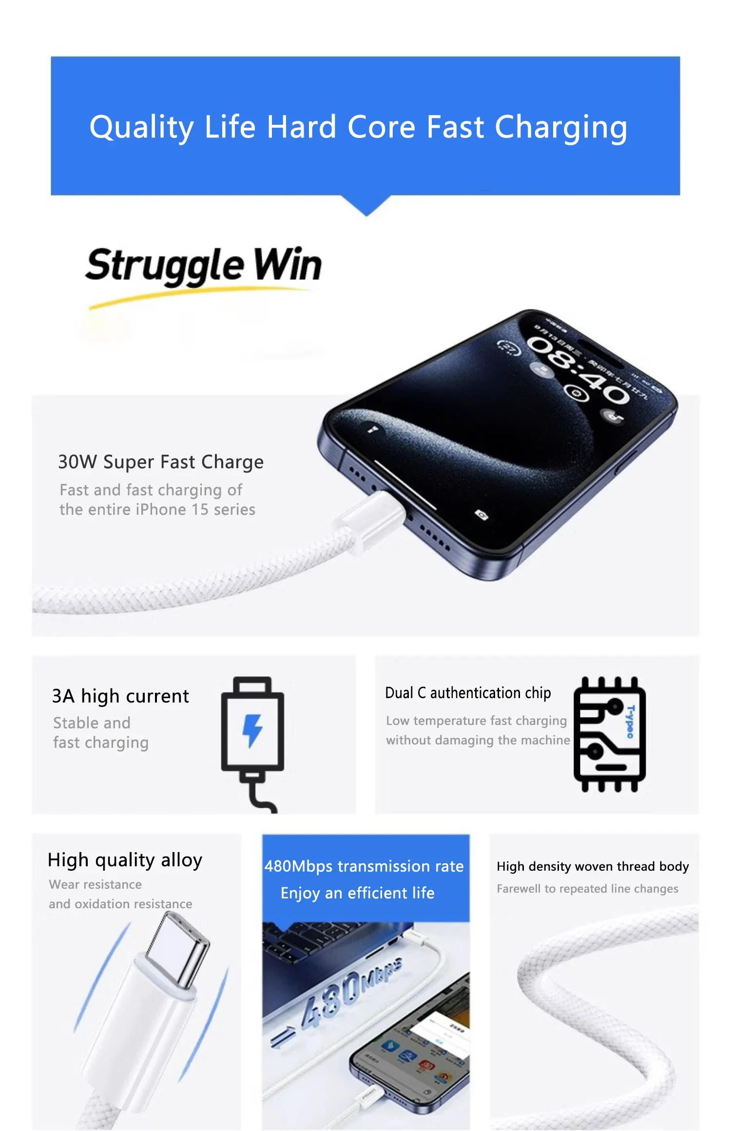 Câble USB-C conçu pour la charge rapide Power Delivery jusqu’à 60W et le transfert de données fiable. Sa finition tressée offre une meilleure résistance à l’usure et une longue durée de vie, idéale pour un usage quotidien avec les iPhone USB-C.