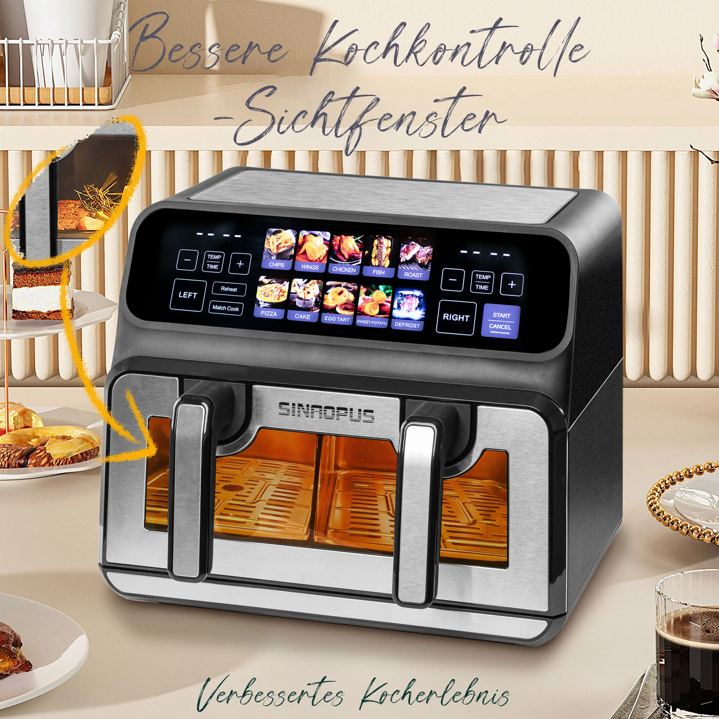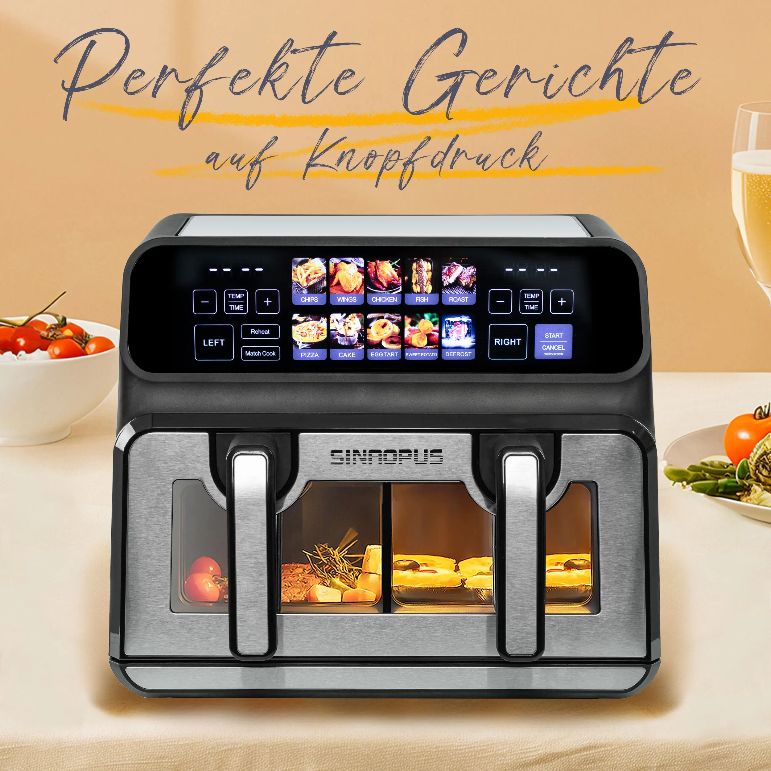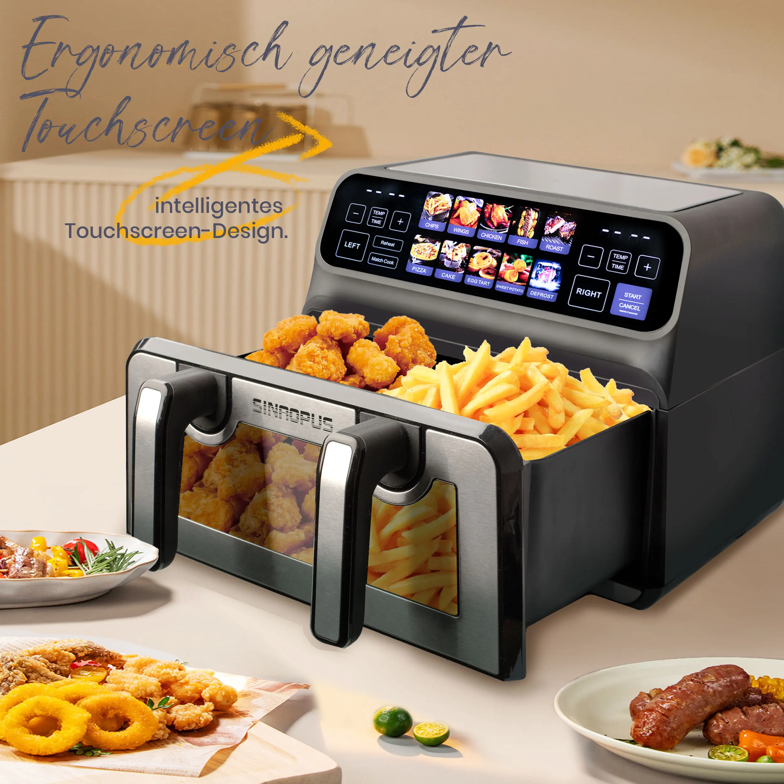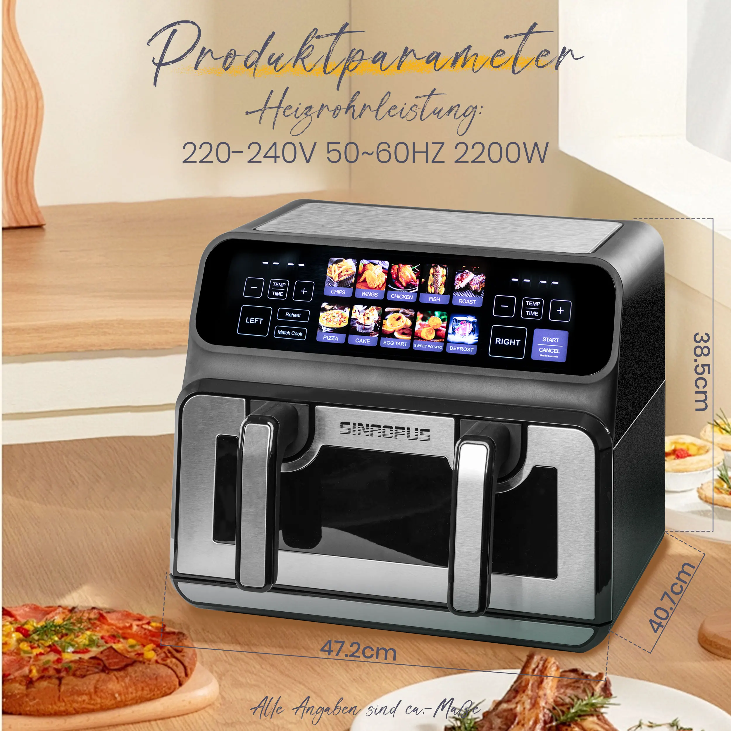 Air Fryer Friteuse à air chaud double panier Sinaopus 9 L – 2200 W, écran tactile LED, 10 programmes, mode double ou grande chambre