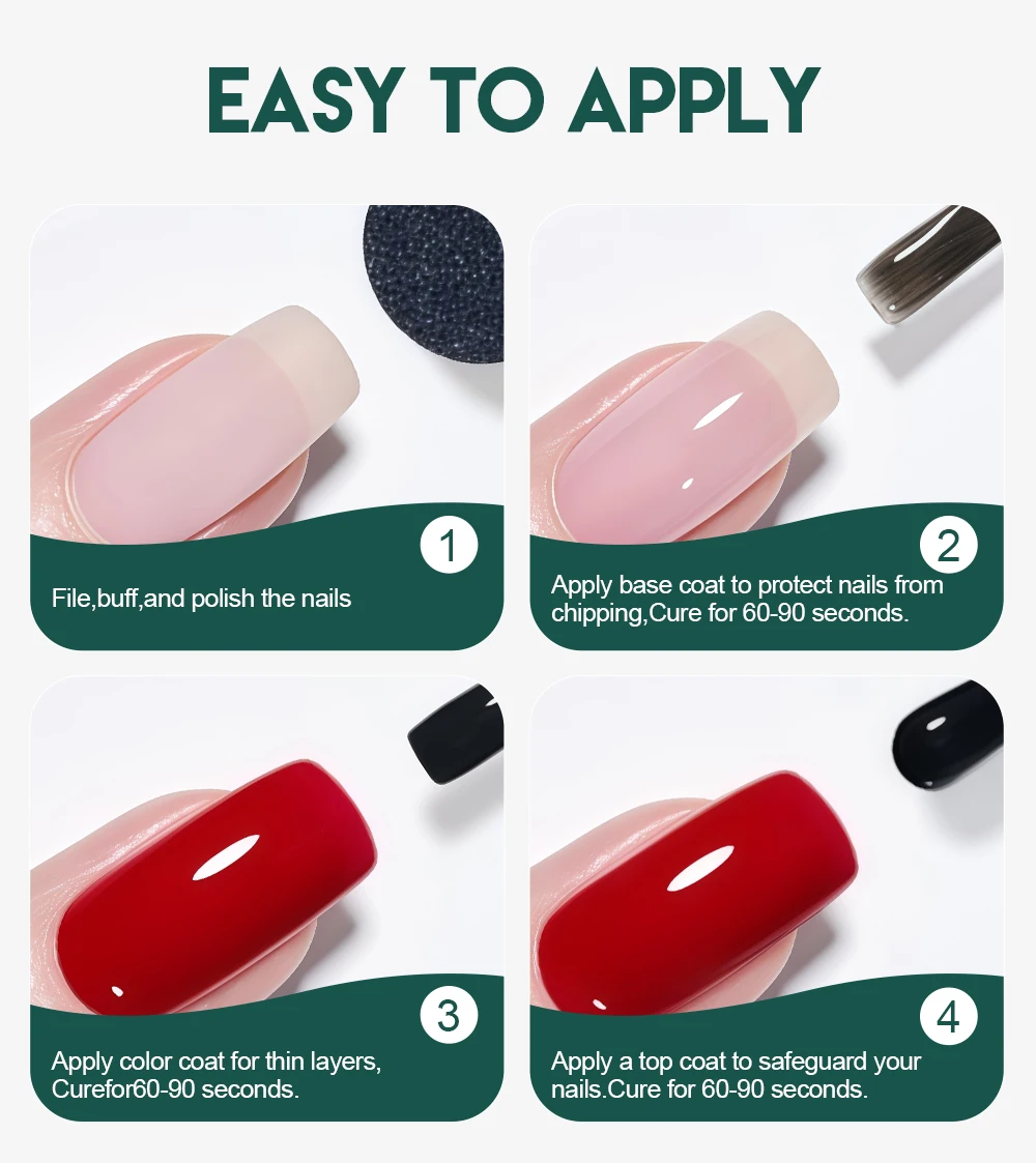 Conseils de sécurité : Appliquer sur ongles propres, éviter le contact cutané direct, suivre les instructions de durcissement UV/LED