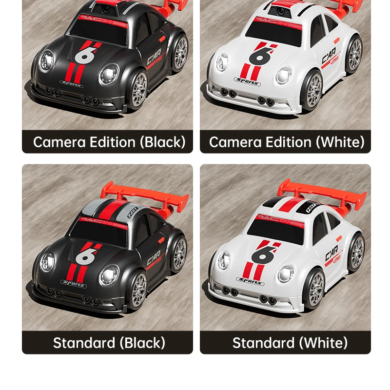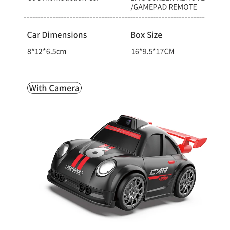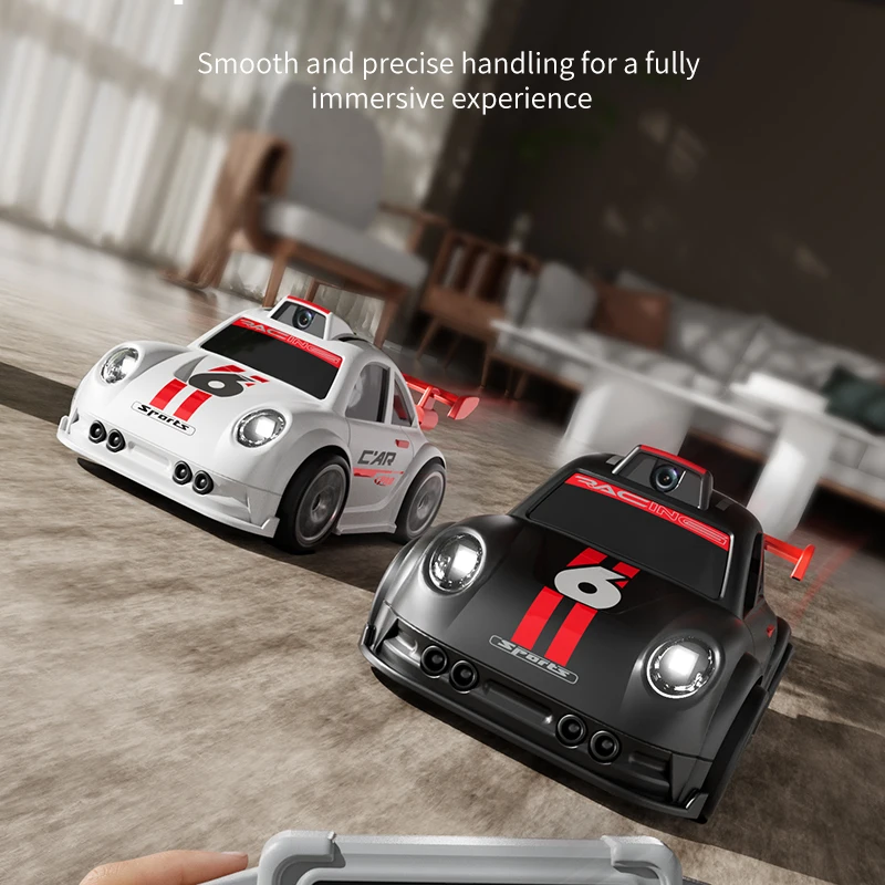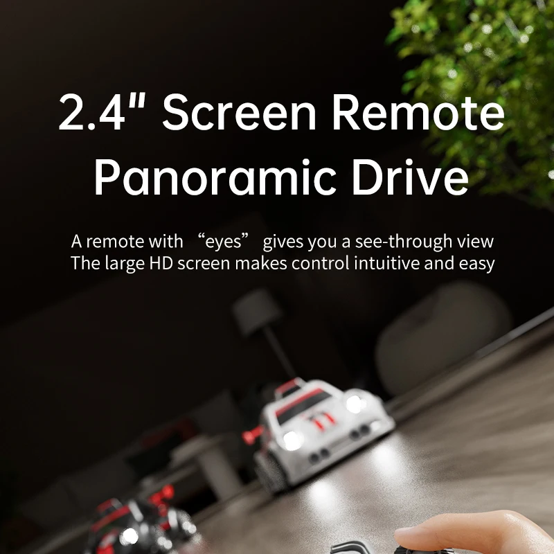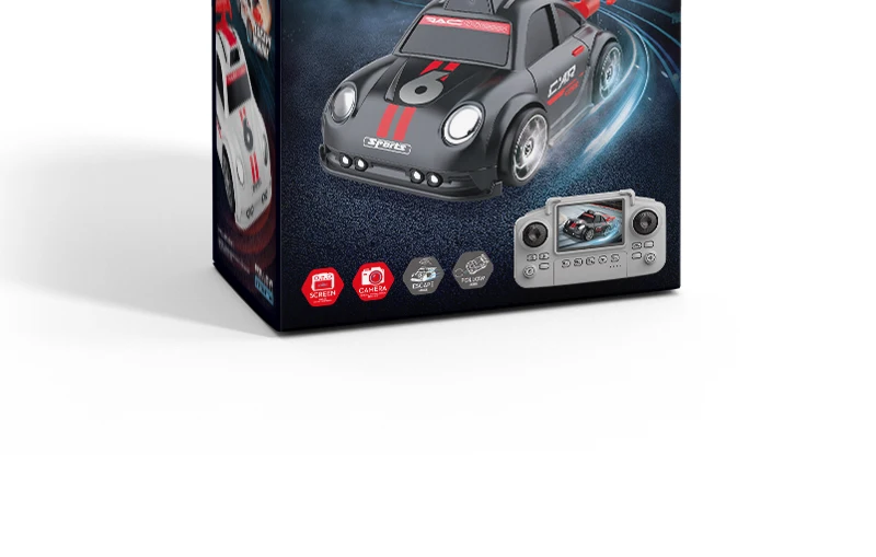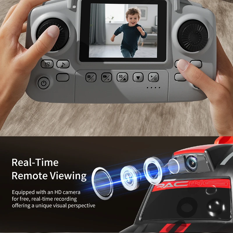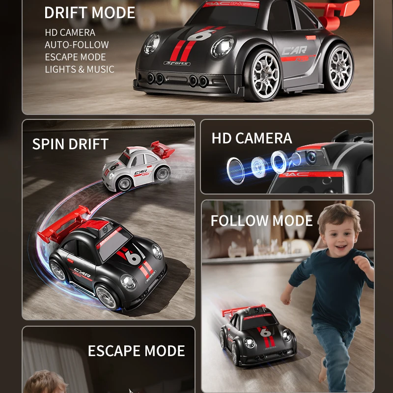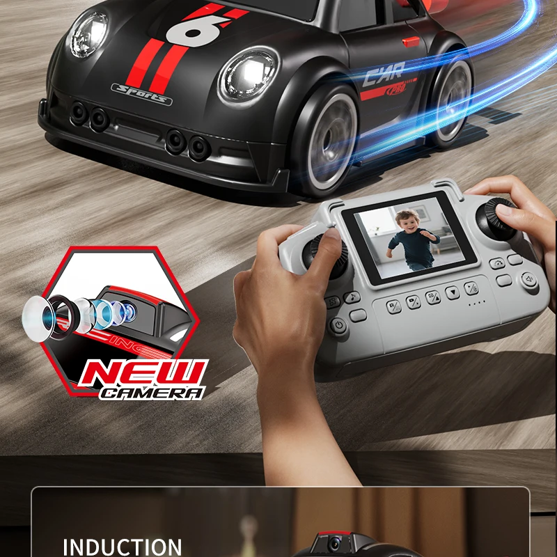 Mini voiture RC pour enfants avec caméra FPV, transmission Wifi, écran intégré et fonctions avancées comme le mode de suivi et la dérive. Parfaite pour les courses et le divertissement interactif.