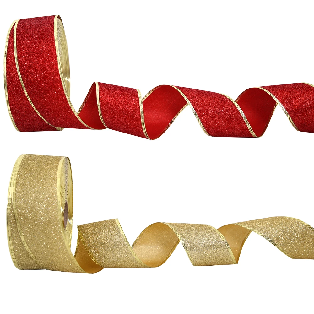 Rubans décoratifs à paillettes de 200cm x 6.3cm, rouge, argent, or, avec fil de fer, pour décoration de noël, nœuds artisanaux