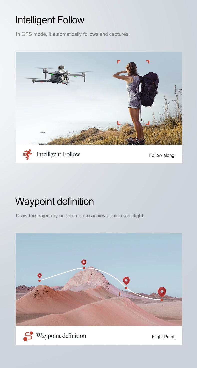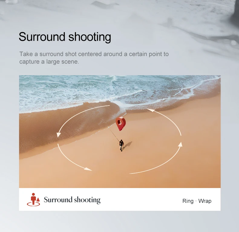 Modes intelligents : Skyrocketing, à distance progressive, suivi intelligent, prise de vue panoramique, orbit autour d’un point d’intérêt