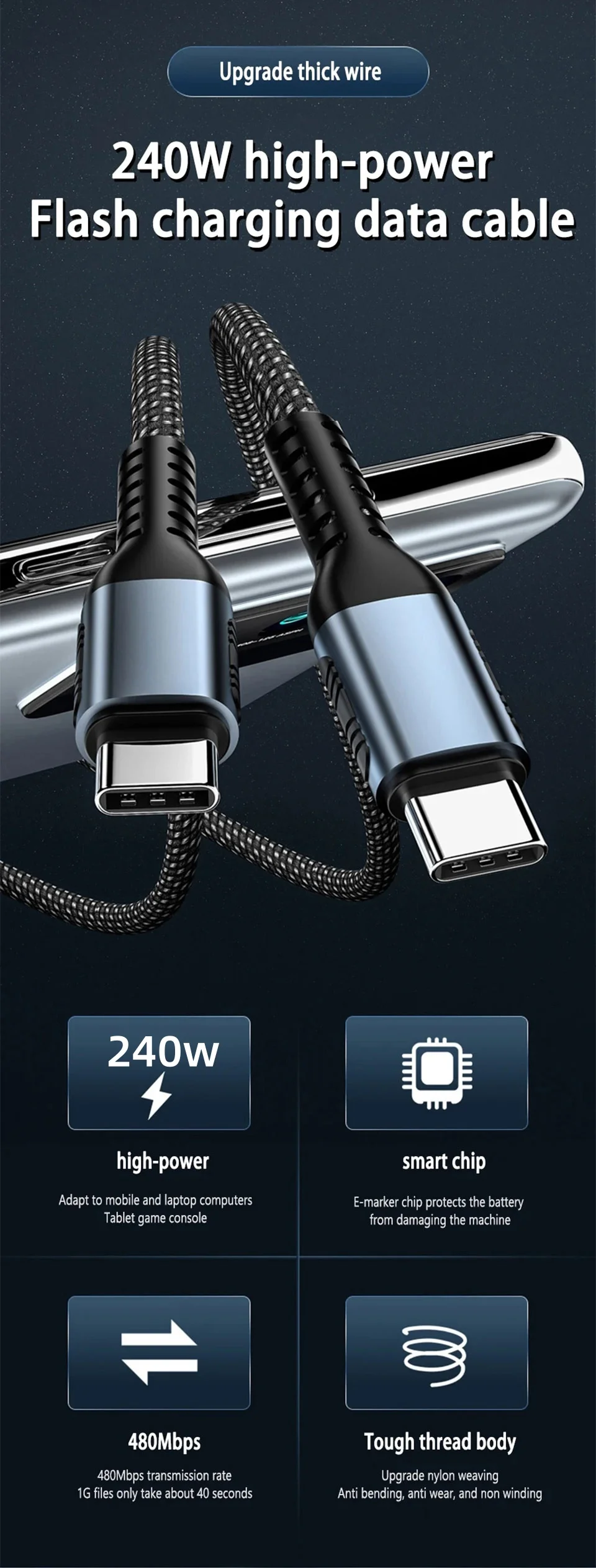 Câble USB-C vers USB-C 240W PD 3.1, charge super rapide 5A pour iPhone 15, Xiaomi, Samsung S23, Huawei, MacBook