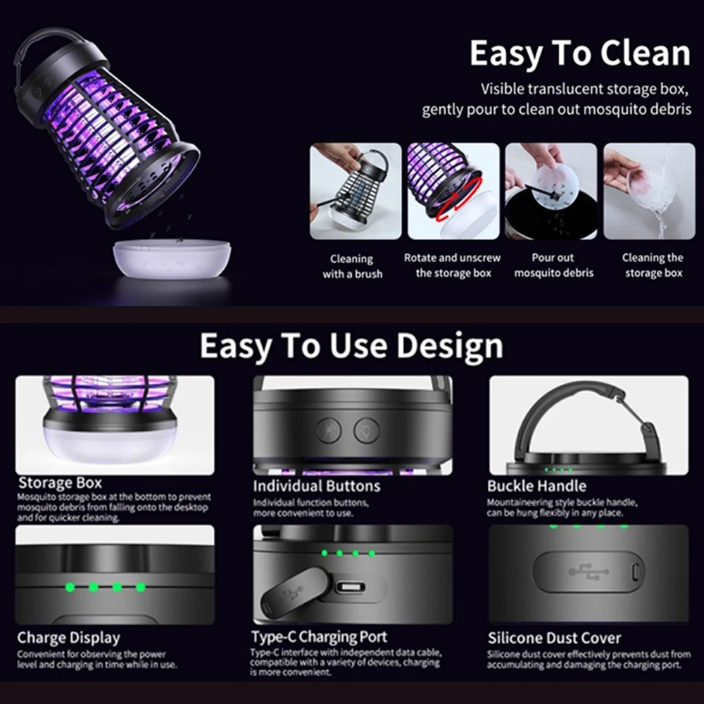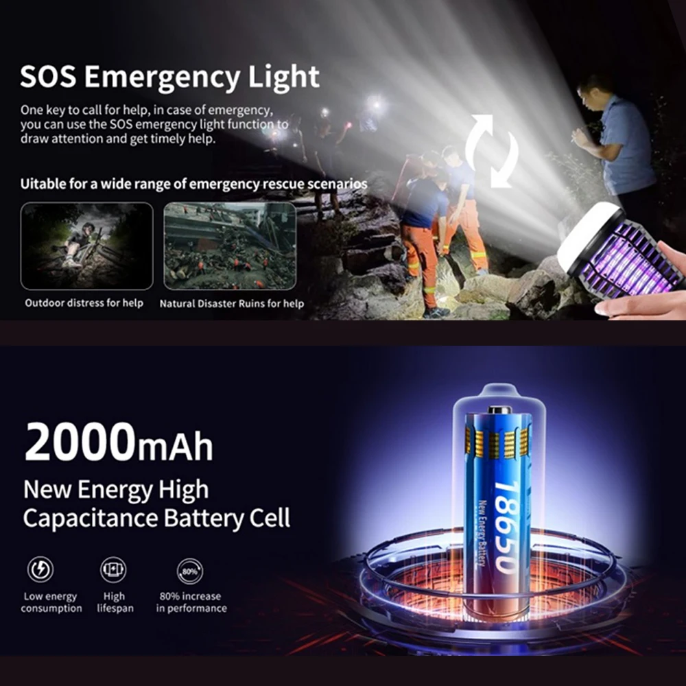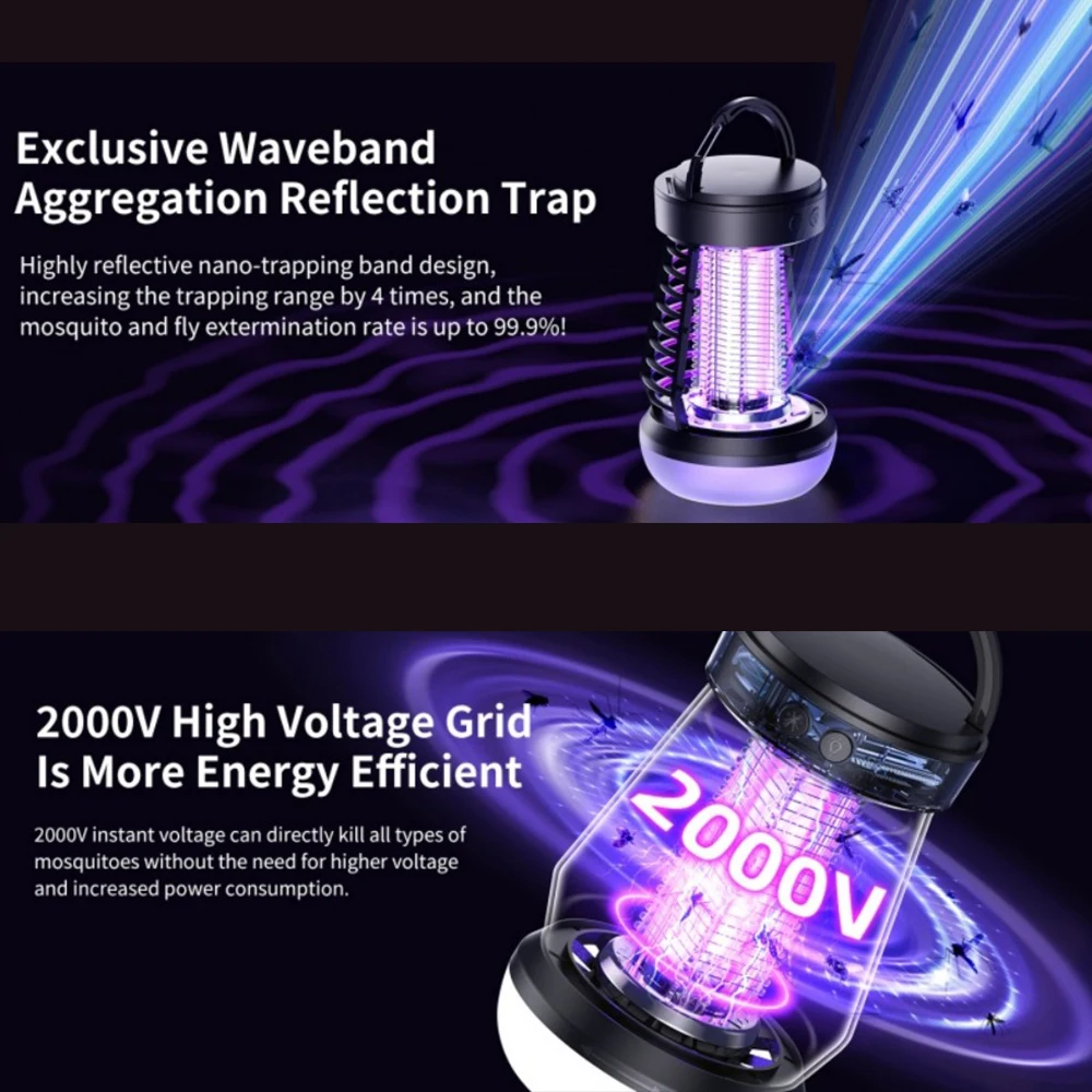 Effective Mosquito Repellent: Upgraded bionic system with 365–395 nm light waves, CO2 + sweat + body temperature simulation, dual spotlight, 720° capture, and 2000V electric shock