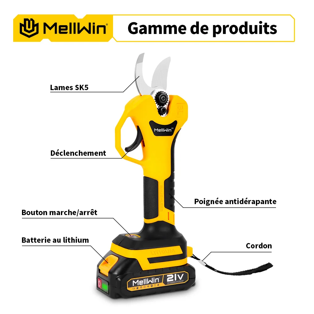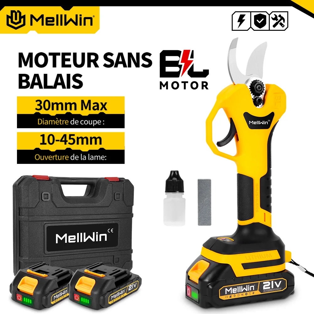 Sécateur électrique sans fil 32 mm MELLWIN – sans balais, cisaille pour arbres fruitiers et bonsaï, ciseaux d’élagage, compatible Makita 18 V / 21 V