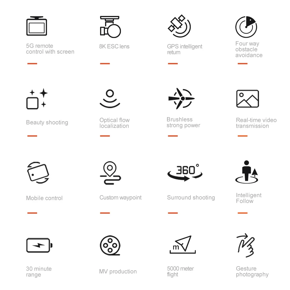 Caractéristiques supplémentaires : Contrôlé par application, Retour automatique, Suivre moi, Compatible FPV, GPS, Caméra intégrée, Évitement d’obstacles, Wi-Fi
