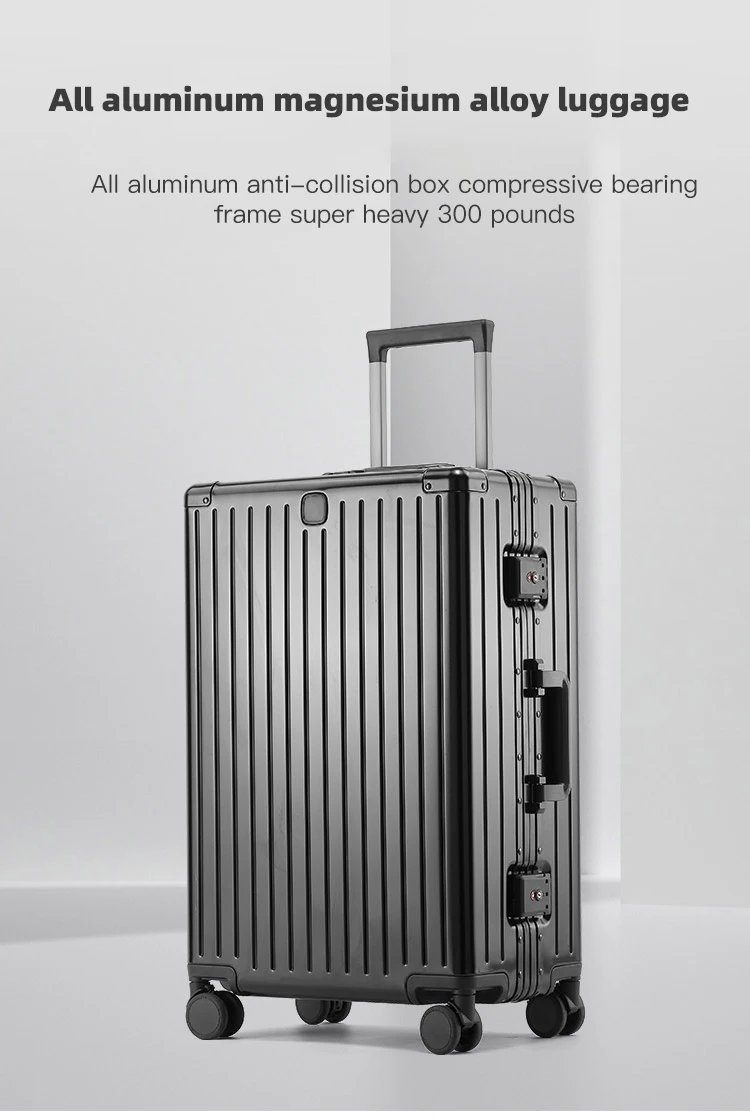 Valise haut de gamme entièrement métallique, conçue pour les voyages personnels ou professionnels, offrant robustesse, durabilité et roulettes pivotantes silencieuses.