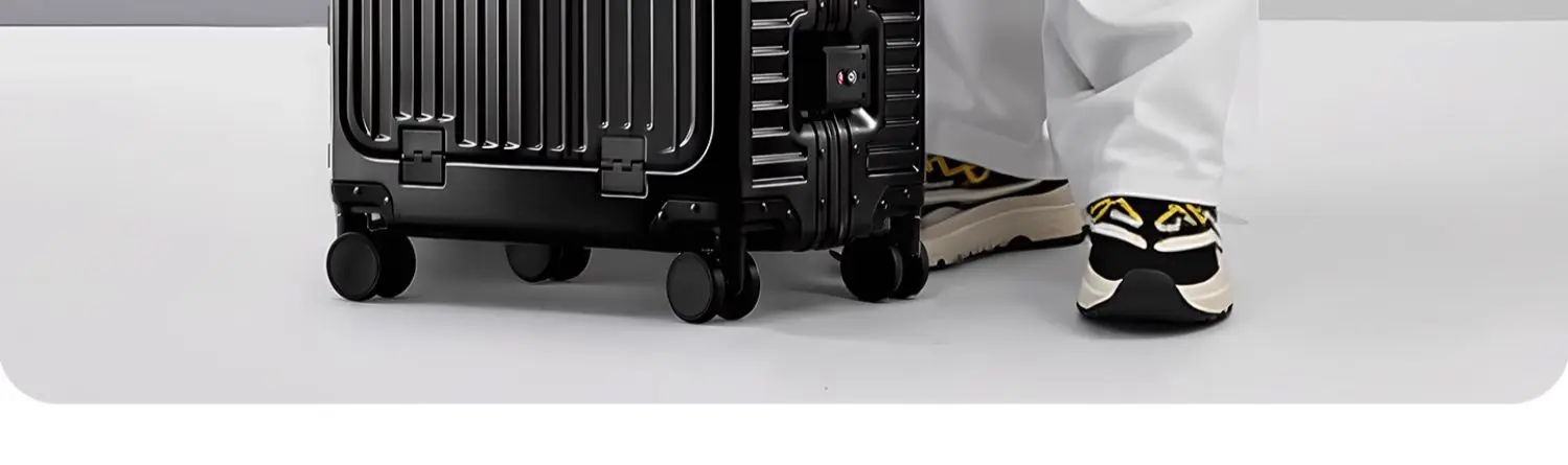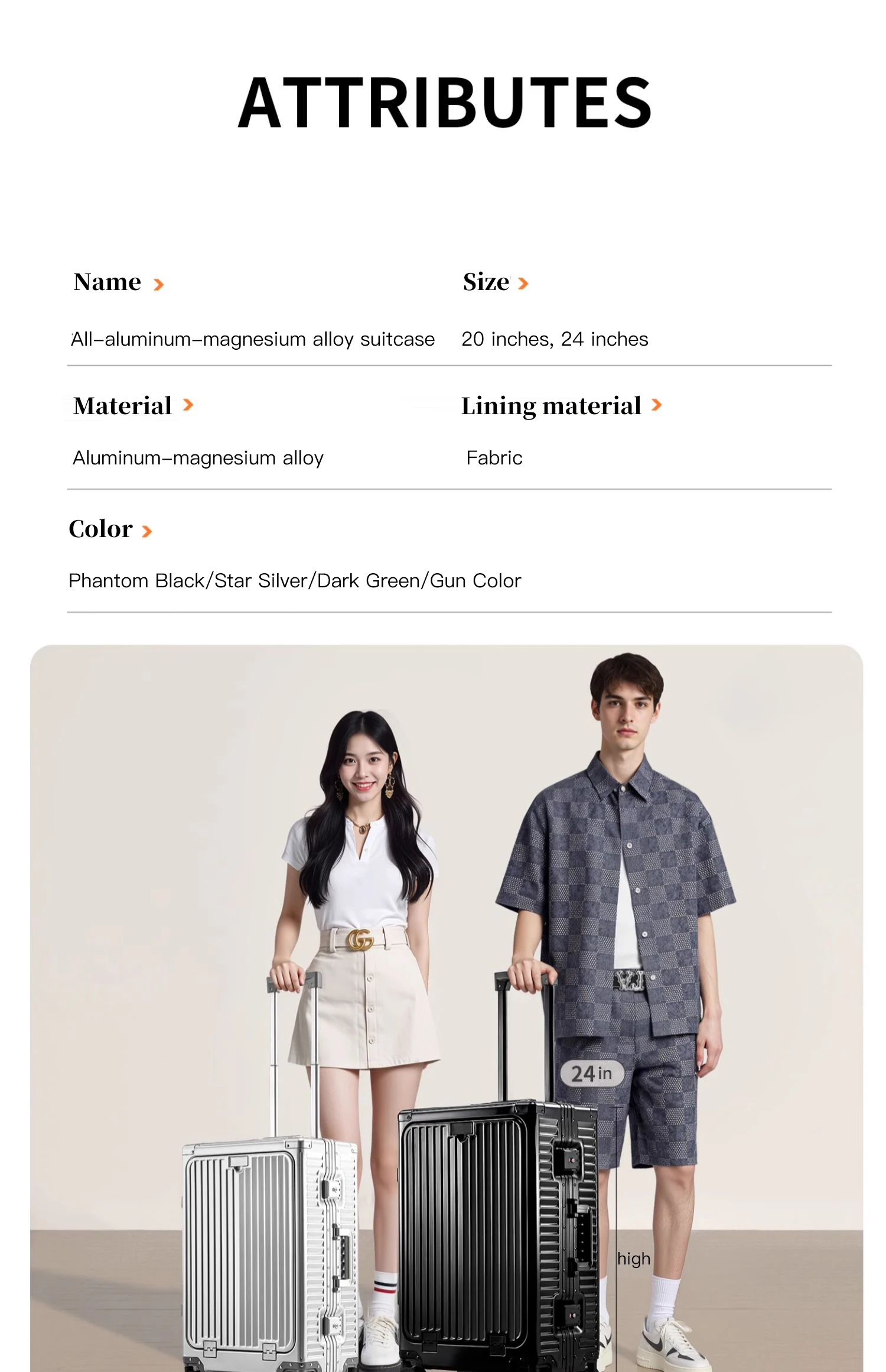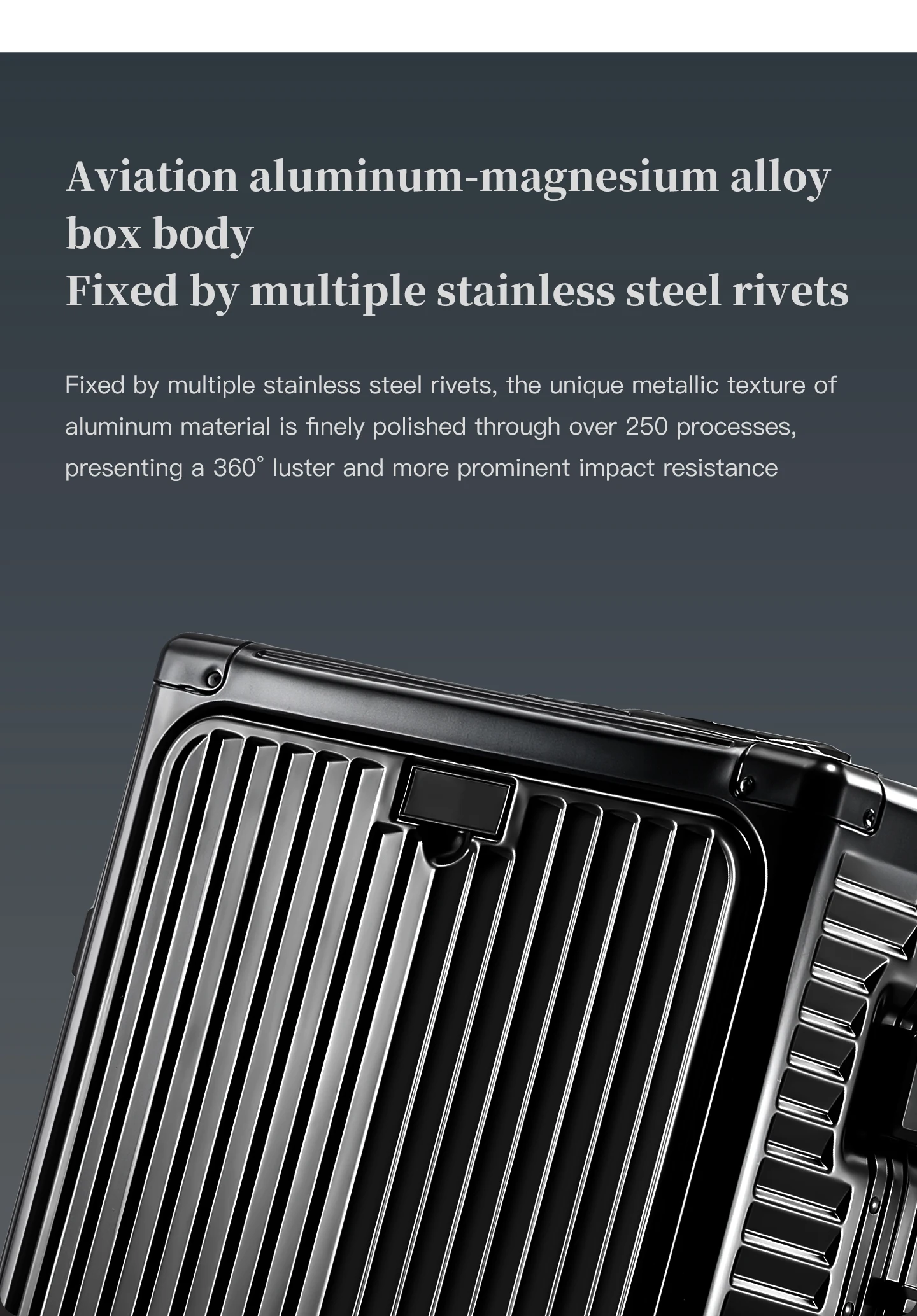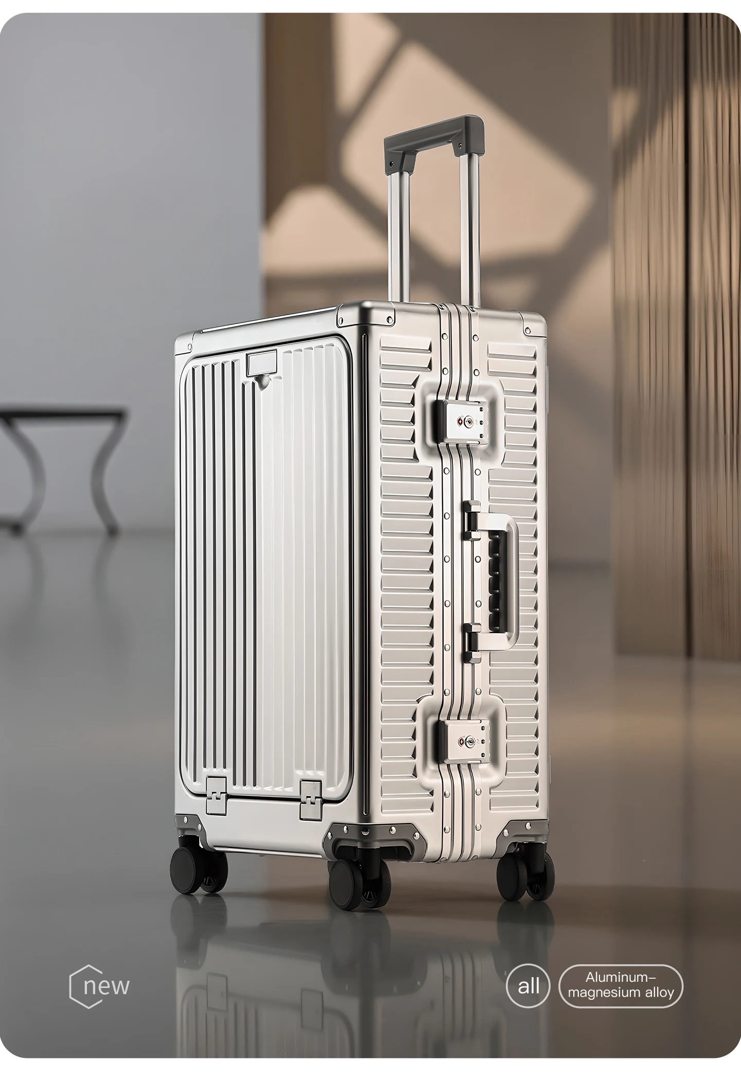 Valise robuste et élégante, conçue pour les voyages personnels ou professionnels, avec coque en alliage d’aluminium et de magnésium, ouverture avant pratique et roulettes pivotantes silencieuses.