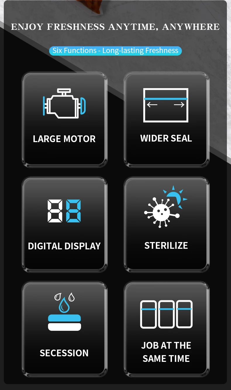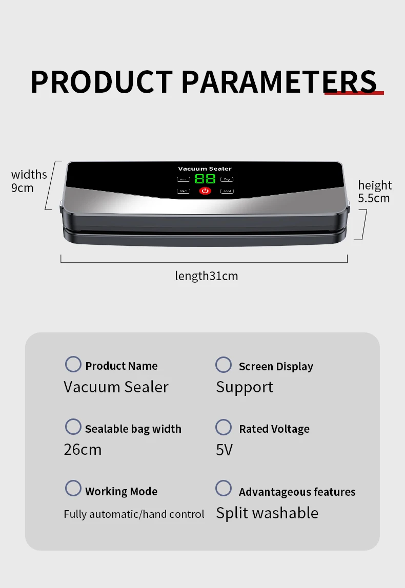 Machine de scellage sous vide compacte et performante, conçue pour prolonger la fraîcheur des aliments et limiter le gaspillage. Équipée d’un système de stérilisation par lumière UV, elle garantit une meilleure hygiène et une conservation plus sûre. Son format support/table et son fonctionnement sans fil en font un appareil pratique pour une utilisation quotidienne en cuisine comme en déplacement.