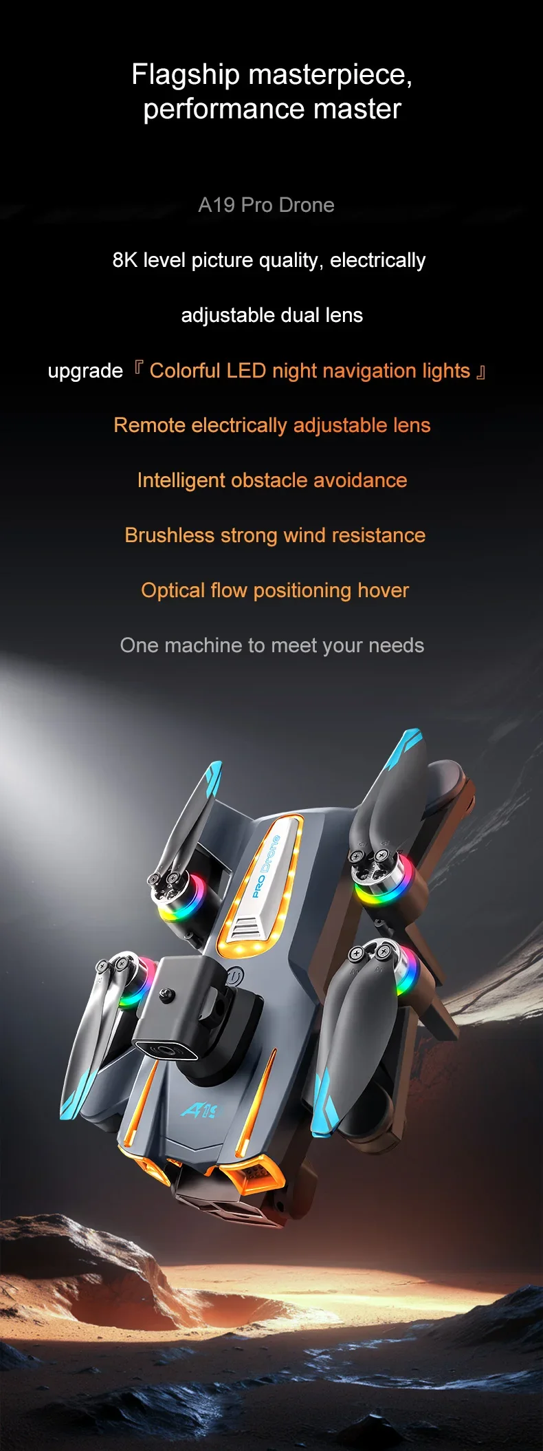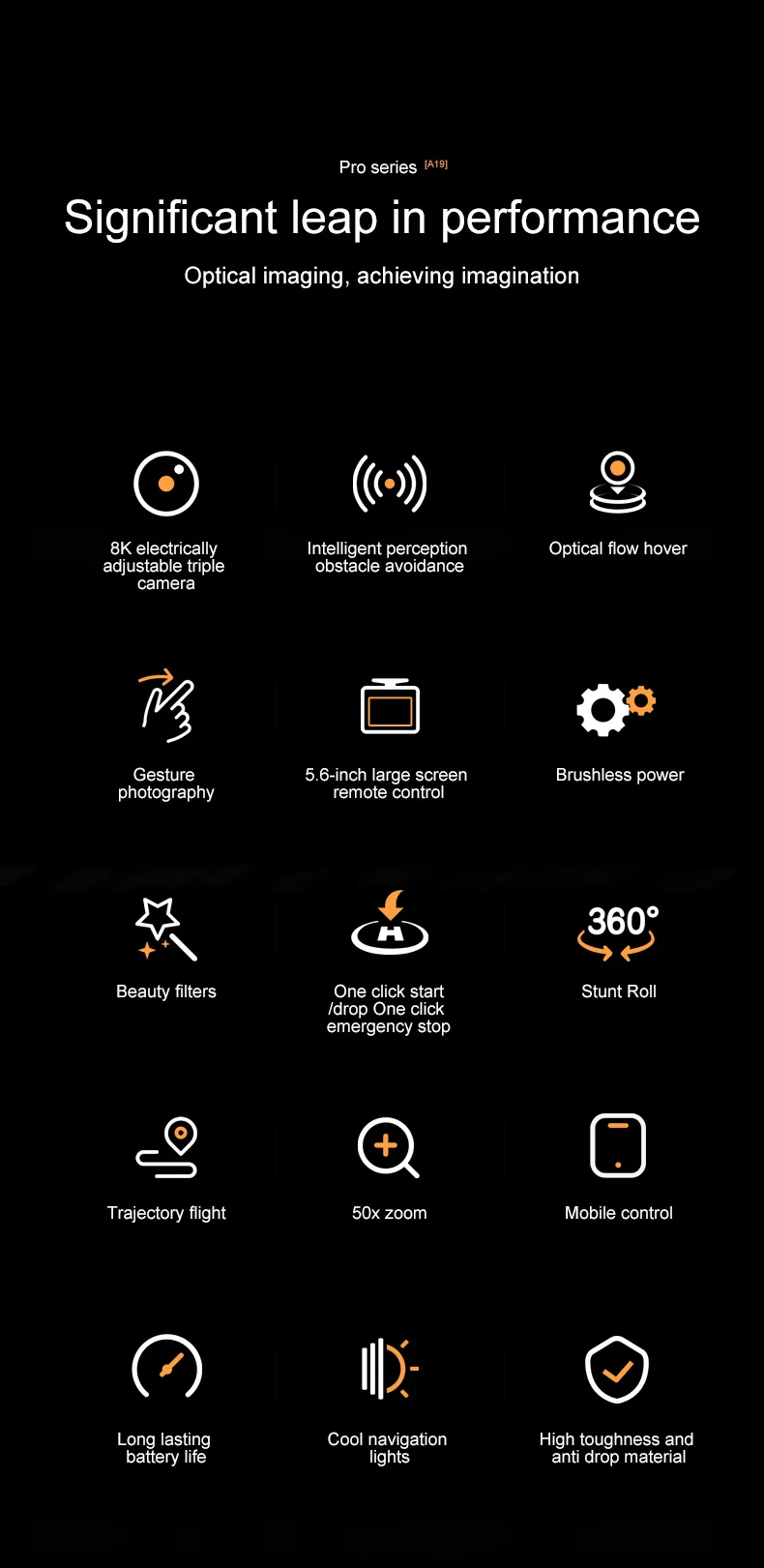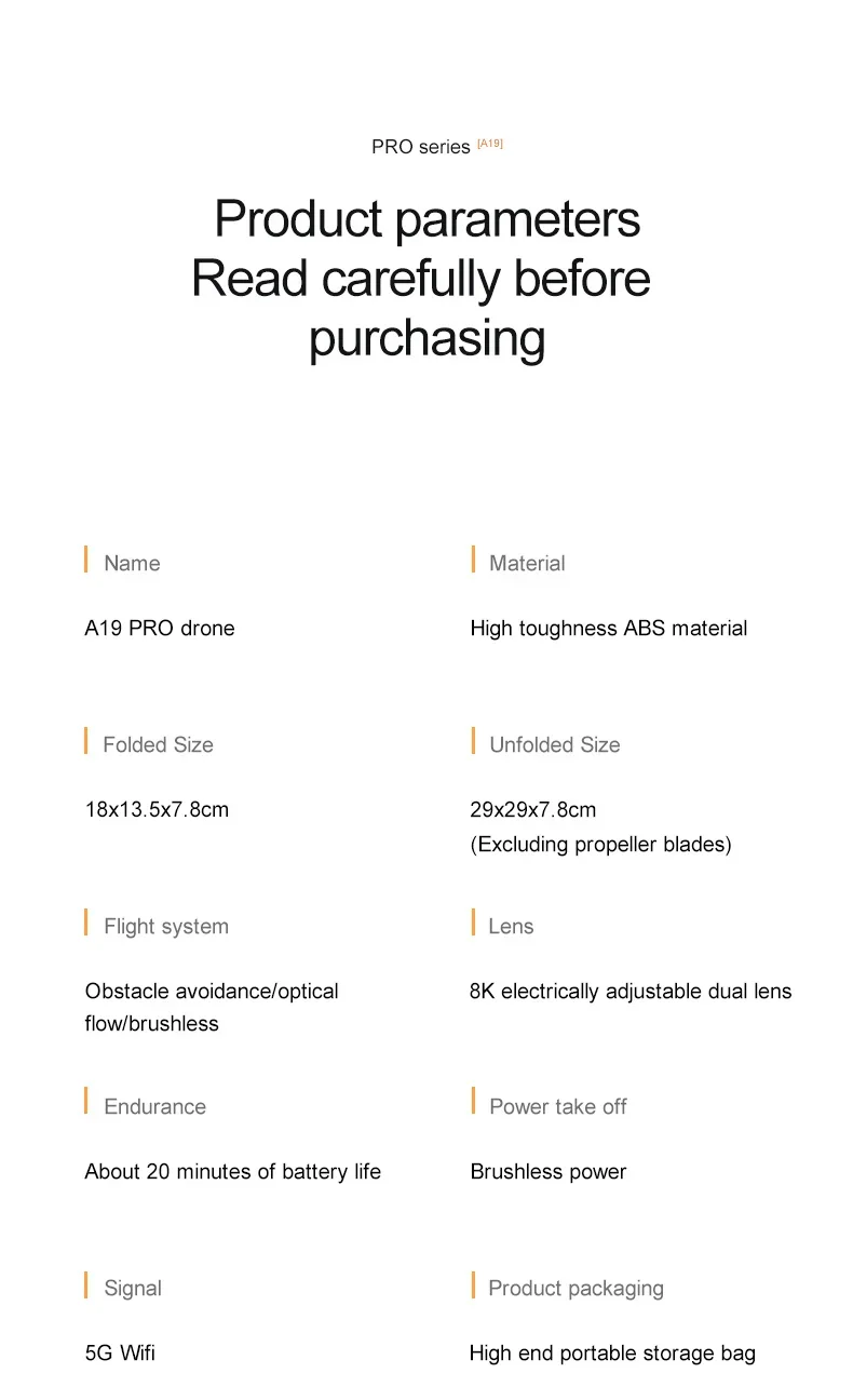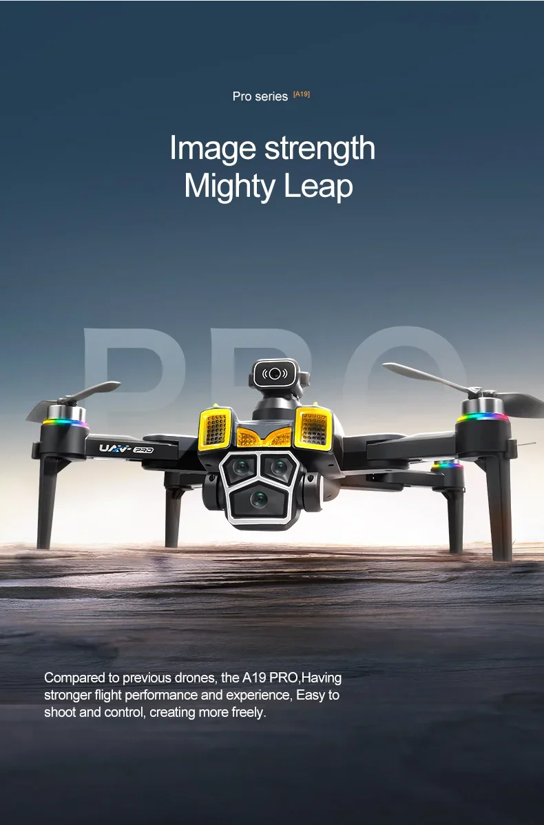 Le A19 Pro est un drone professionnel équipé d’une caméra 8K, moteur sans balais et écran de 5,6 pouces. Léger et puissant, il offre un vol stable grâce au flux optique, à l’évitement d’obstacles et au contrôle FPV pour une expérience de pilotage complète.