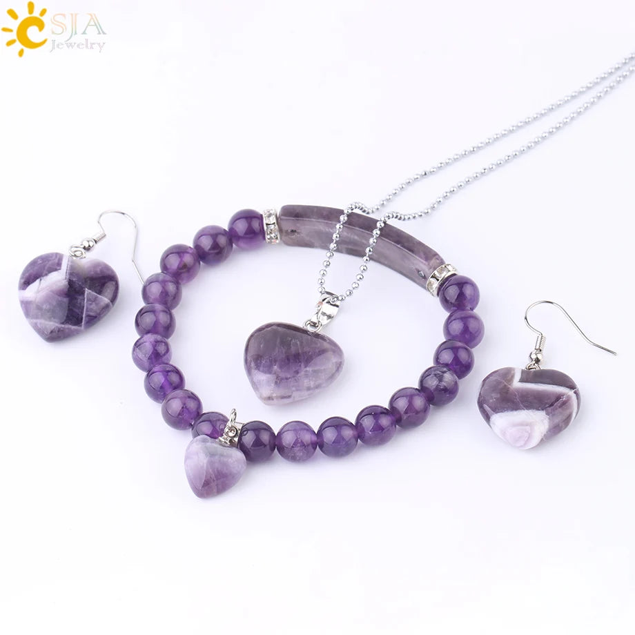 Périmètre intérieur du bracelet : environ 15,5 cm (élastique, taille de perle de 8 mm) Caractéristiques de la parure de bijoux : En forme de cœur + naturel Ensemble de bijoux en améthyste Utilisation : bijoux quotidiens, bijoux de fête, fête de fin d'année, ensemble de bijoux cadeaux Emballage : collier + boucles d'oreilles + bracelet Usine : CSJA Couleur : plaqué
