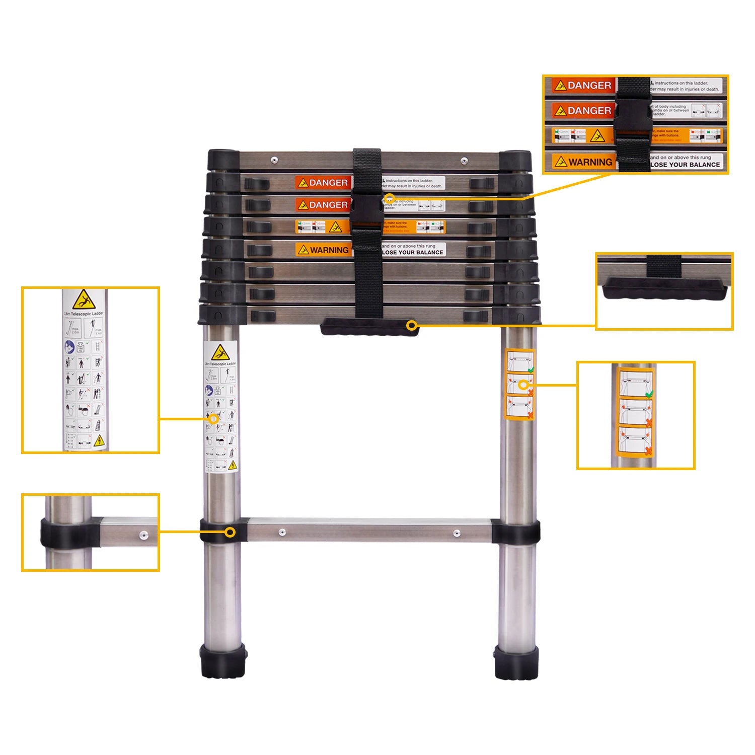 Sûr et fiable - Nos échelles télescopiques présentent un design durable en acier inoxydable, des loquets à verrouillage en hauteur de qualité industrielle et de solides pieds antidérapants à pointe en caoutchouc au bas de l'échelle pour une montée de sécurité.