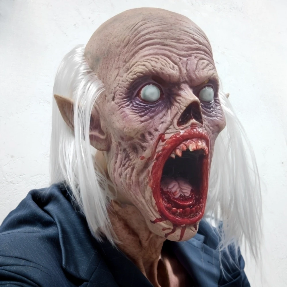 Les cheveux blancs du masque et les détails sanglants de la bouche créent une apparence de vampire réaliste.