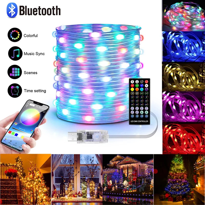 Guirlande Lumineuse LED RGBIC 5/10/20m avec Télécommande, synchronisation des couleurs avec la musique, Décoration de Noël, Chambre et Jardin, DC 5V