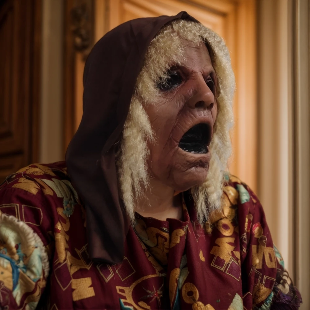 Design réaliste et terrifiant – représente probablement un visage urlante, vieilli et fantomatique (appelant un « Old Nana » ou un esprit malevolent) avec des détails exagérés de style film d'horreur.