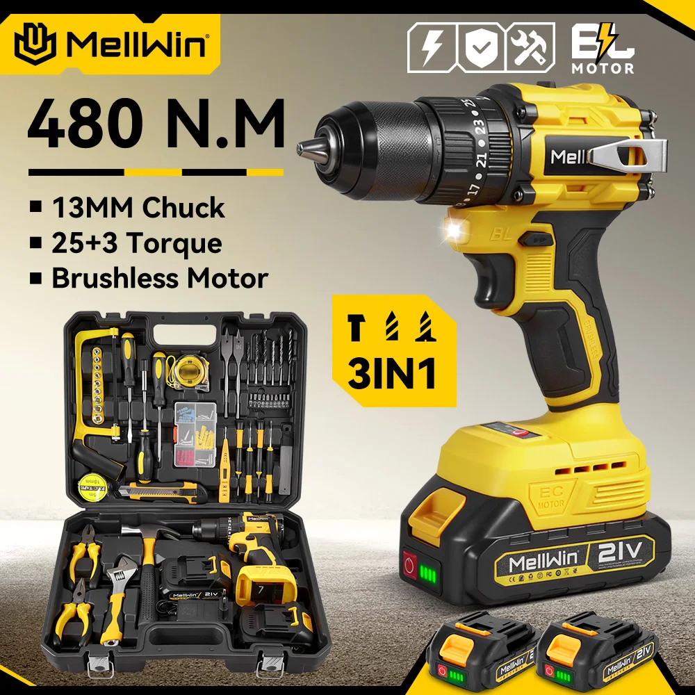 MELLWIN 480N.m ensemble de perceuse à percussion électrique sans brosse 3 en 1 jeu d'outils de tournevis polyvalents sans fil pour broche de batterie Makita 18V