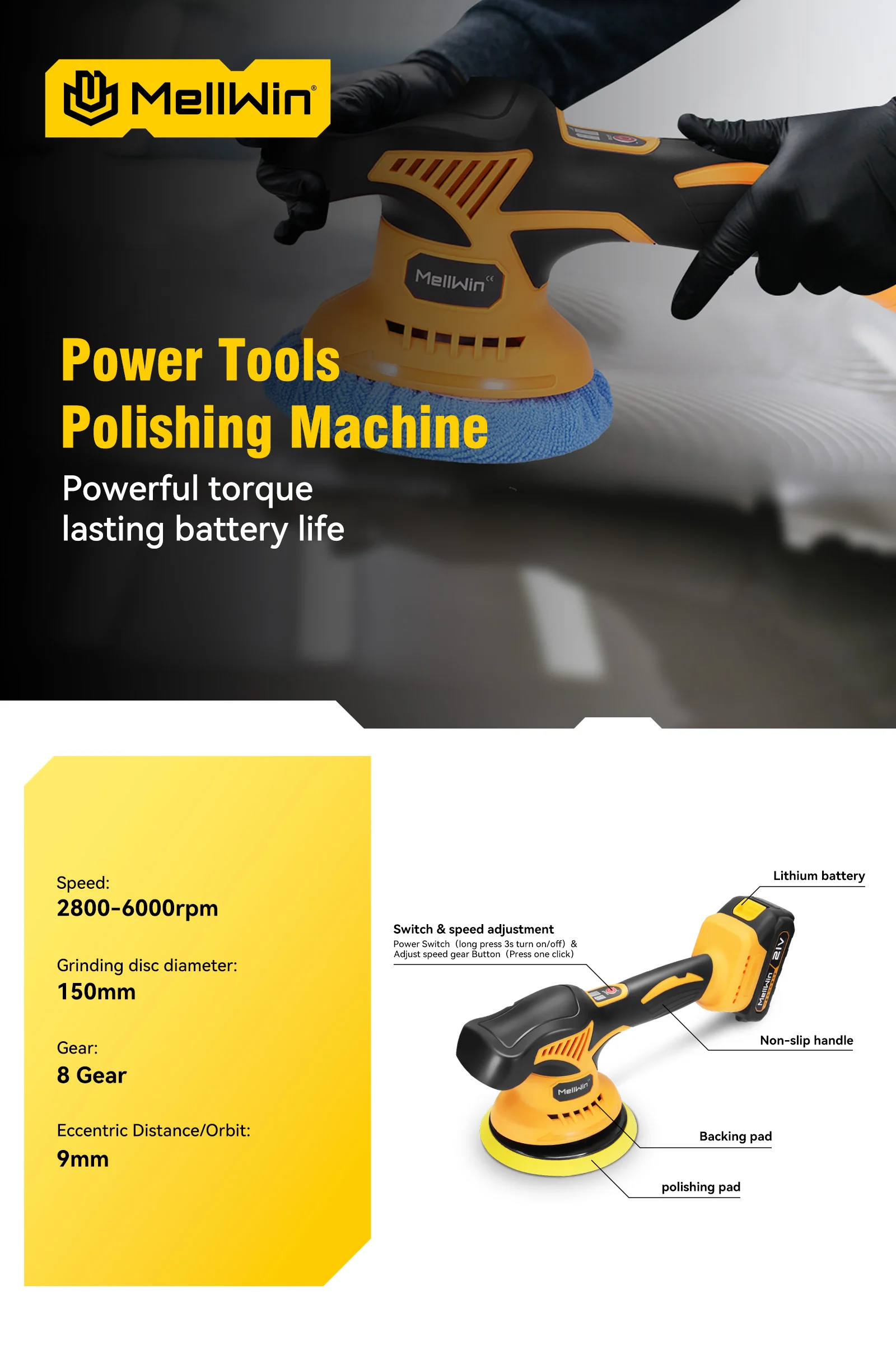 Polisseuse électrique sans fil MELLWIN 150 mm – 8 réglages, ponçage et polissage pour voiture, outil rotatif pour broches de batterie Makita 18V / 21V
