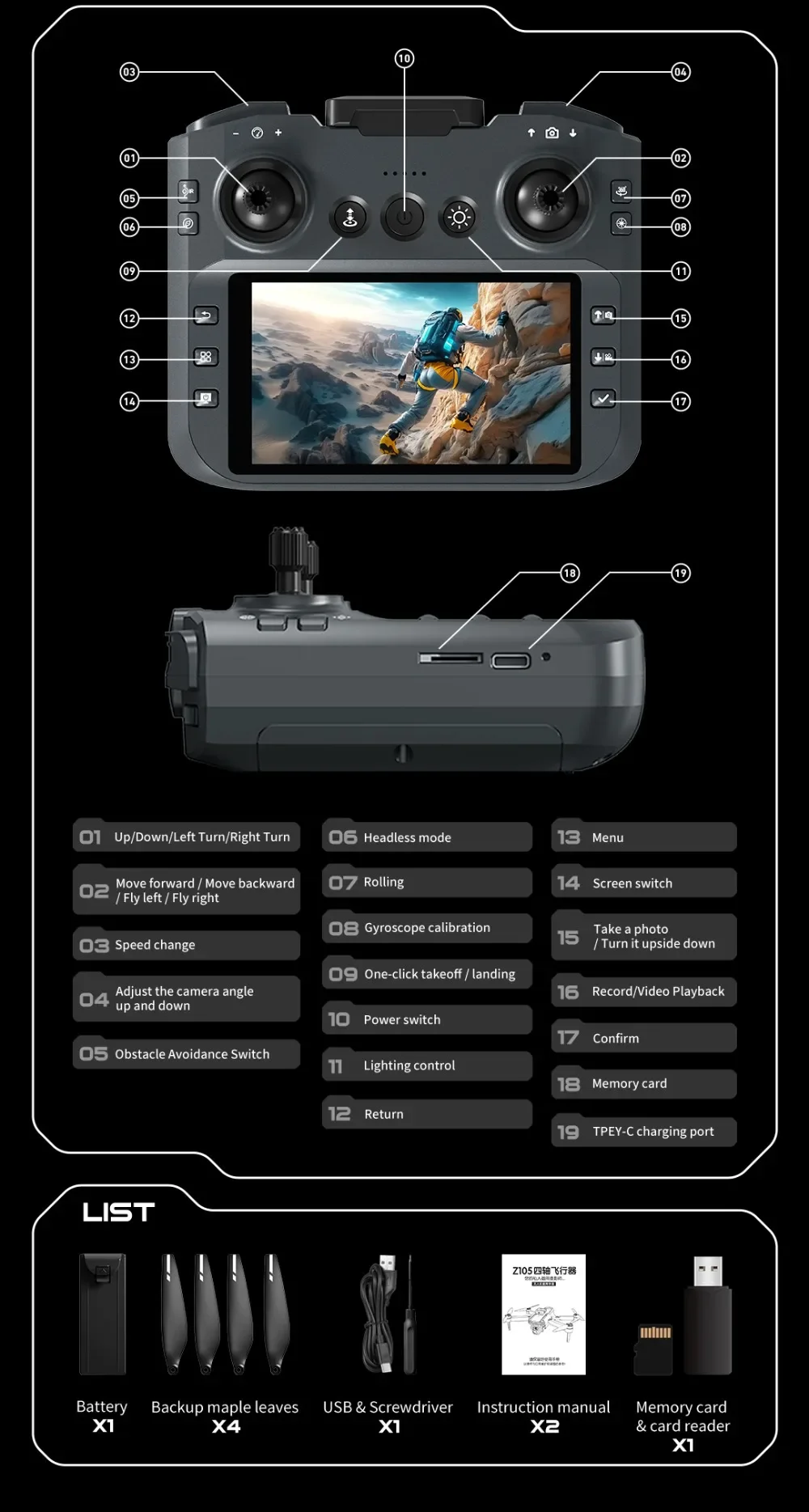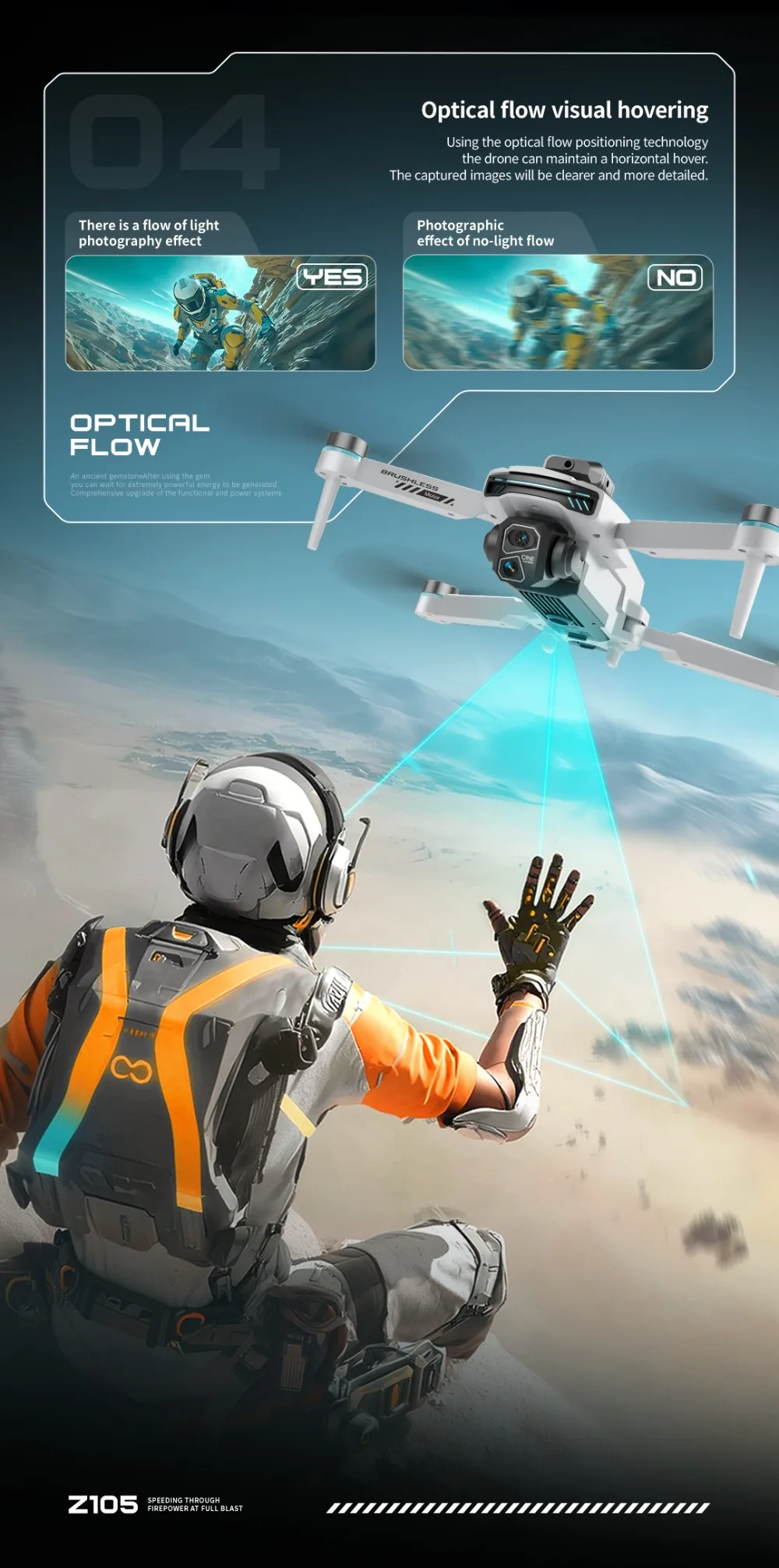 Le drone Z105 est un quadricoptère professionnel équipé d’une caméra 8K, d’un moteur sans balais et d’une télécommande avec écran, offrant un vol stable, un enregistrement haute définition et un système d’évitement d’obstacles complet.