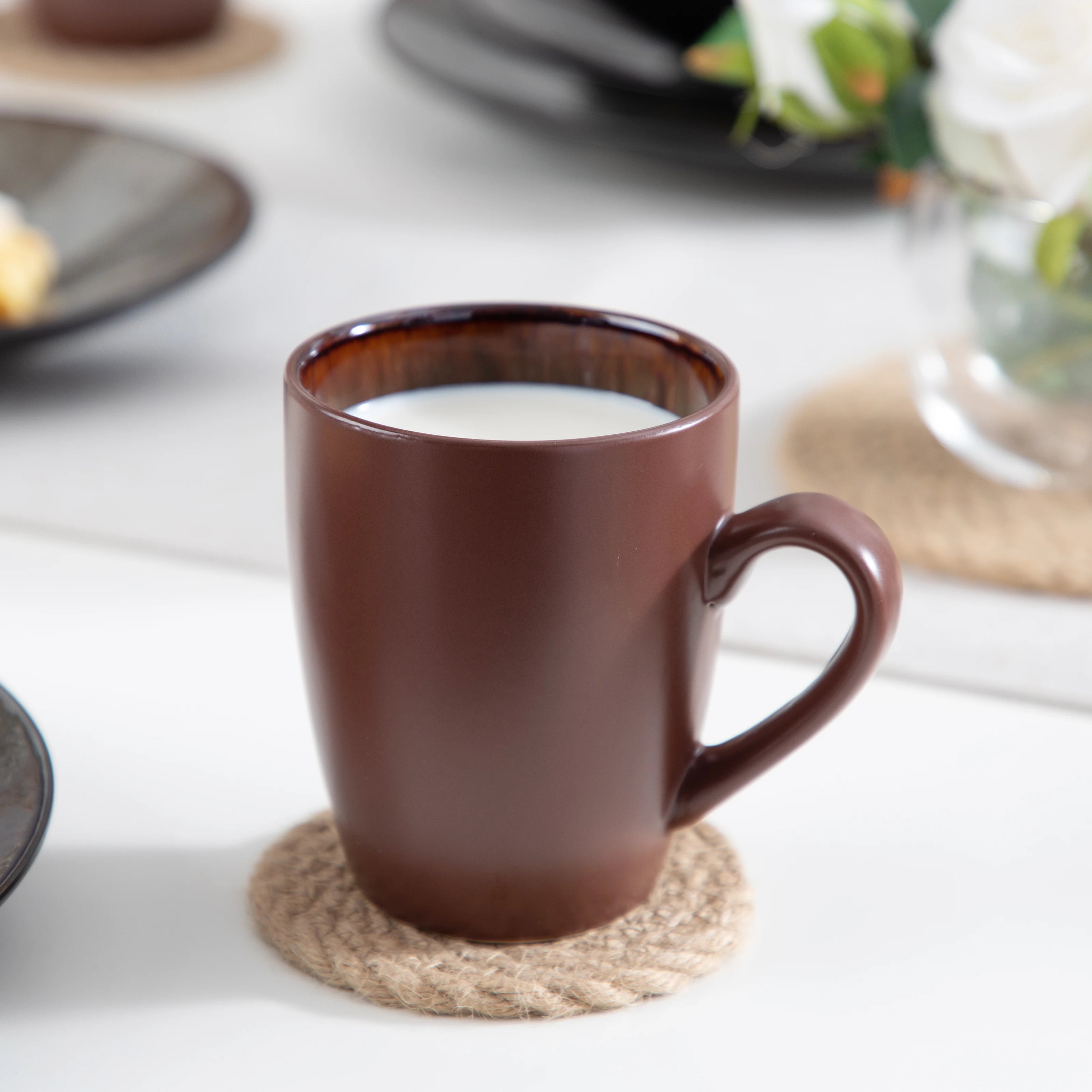 Service de 16/32/48 Pièces en Céramique Vintage, Grès Brun, Ensemble avec 4 assiettes plates Ø 27,3 cm, 4 assiettes dessert Ø 21,3 cm, 4 tasses à café 380ml et 4 bols à céréales