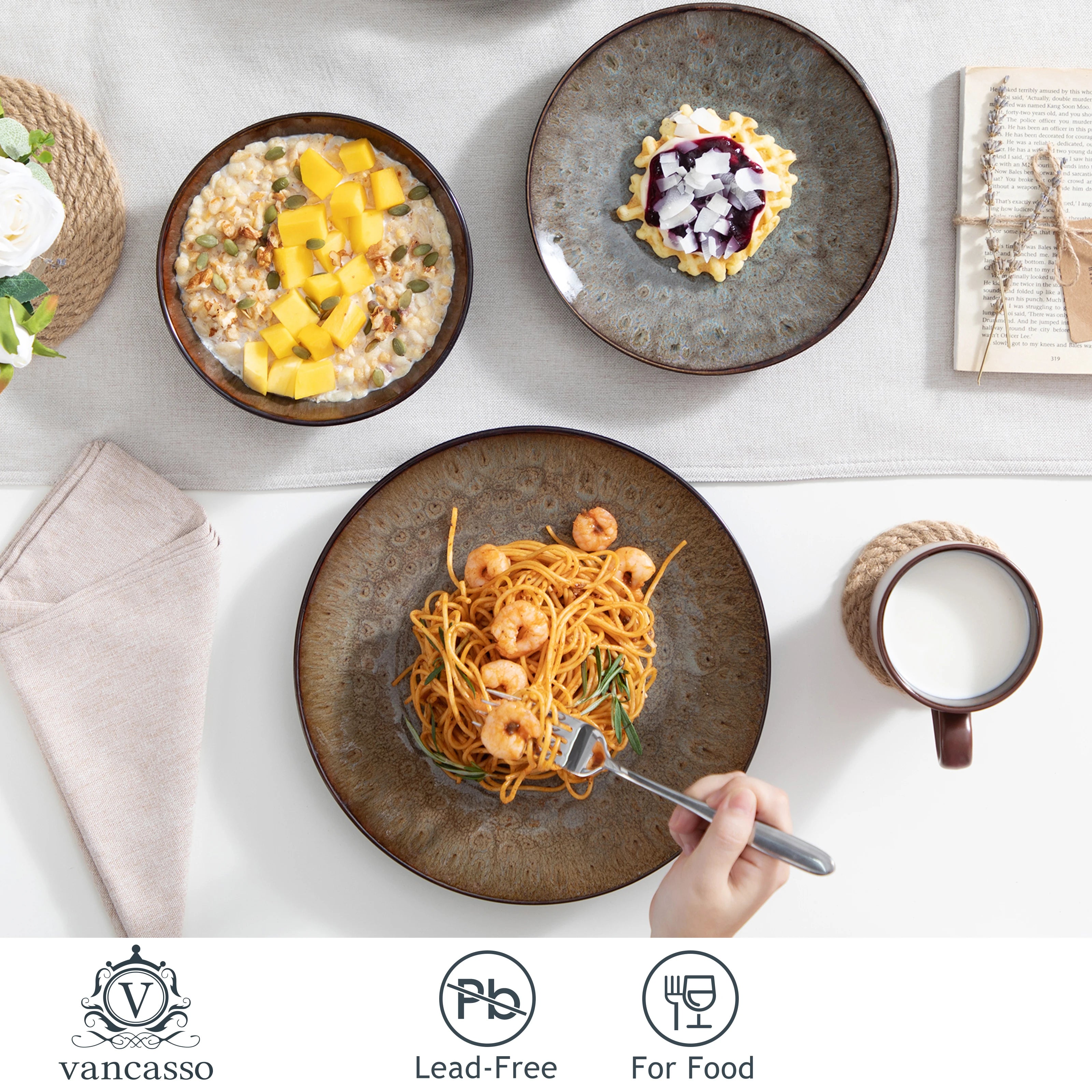 Design extraordinaire.Le service de vaisselle vancasso est fait à la main à partir de grès de haute qualité et respectueux de l'environnement. La surface émaillée lisse et exquise, le dos mat, le design peint à la main et l'aspect vintage élégant créent une harmonie unique et agréable.